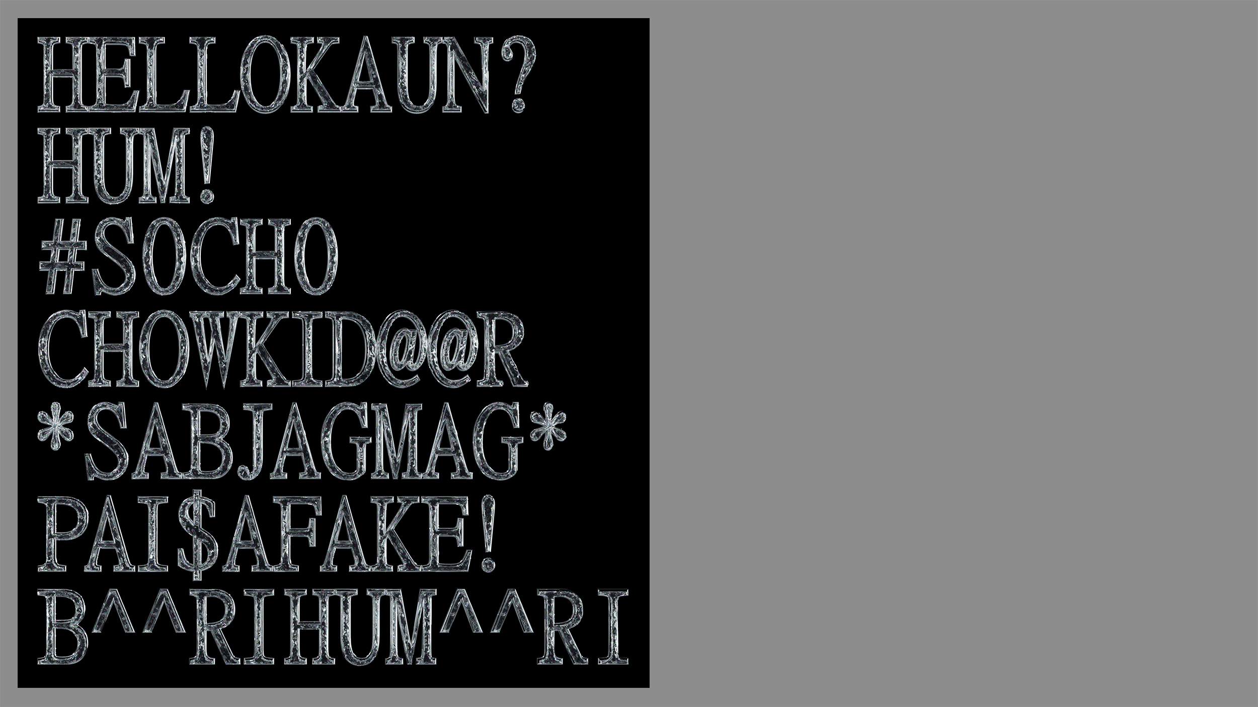 The lettering is based on Bangla drawings by Satyajit Ray for ‘Hirak Rajar Deshe’. Hirak references the land of diamonds known for its huge mines. Roy uses subversive, trans-continental form of hip hop to articulate ongoing contemporary political anxieties in India.